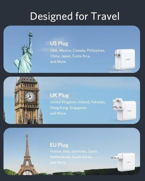 • Designed for Travel: With an ultra-compact design that supports simultaneous laptop charging and interchangeable plugs for use in the US, UK, and Europe, this is the ultimate travel charger.